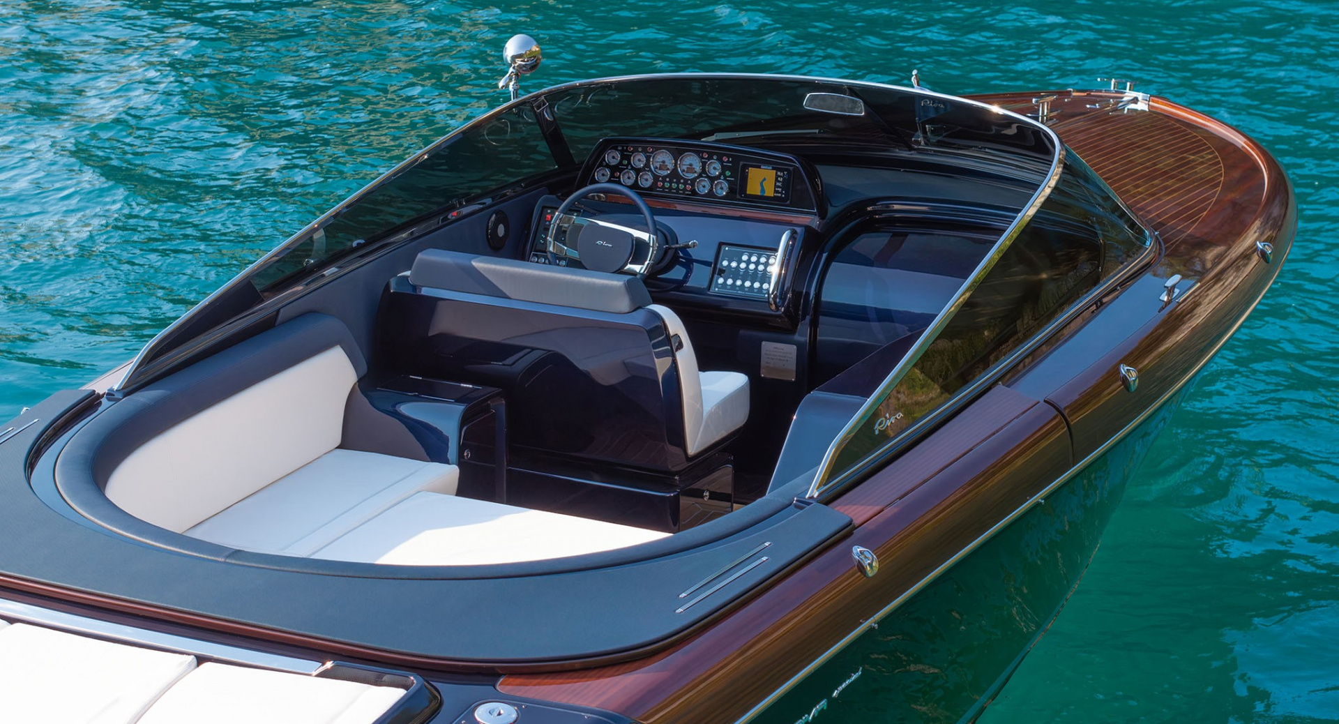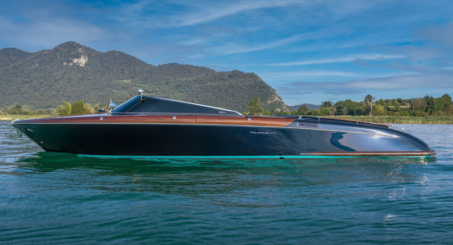 Модель Aquariva Super является одной из визитных карточек итальянского бренда Riva, при взгляде на которую даже неспециалист четко определяет принадлежность бренду. 33-футовый открытый катер Aquariva Super является преемником легенды 60-х - модели Aquarama. Слово Super здесь означает большую мощность в сравнении с ранее созданными моделями. Автоматическая коробка передач с электронным управлением выявляет всю силу двух двигателей Yanamar по 370 л. с. каждый. Круизная скорость Aquariva Super составляет 36 узлов, максимальная — 41,5 узел. Внешний облик Aquariva Super — это результат совместной работы студии Officina Italiana Design, традиционно создающей дизайн яхт Riva, а также внутреннего подразделения Ferretti Group. Детали из нержавеющей стали — сами по себе шедевры. Палуба из красного дерева с 18 слоями лака укреплена вставками из клена. Максимальная вместимость катера – 8 человек, которые могут разместиться в просторном кокпите. Скользящий люк открывает доступ в небольшую каюту, в интерьере которой использованы те же материалы, что и в экстерьере: красное дерево и светлая кожа.